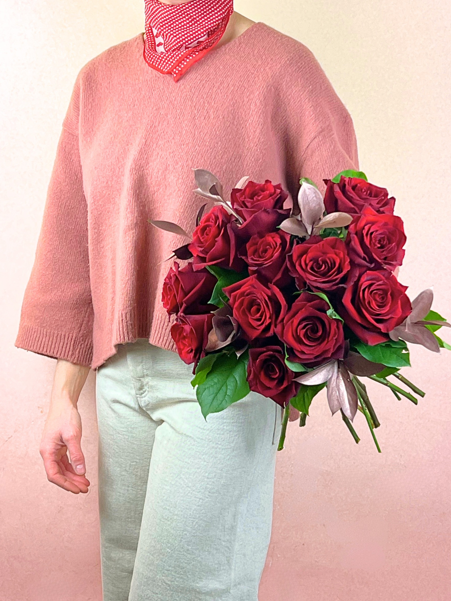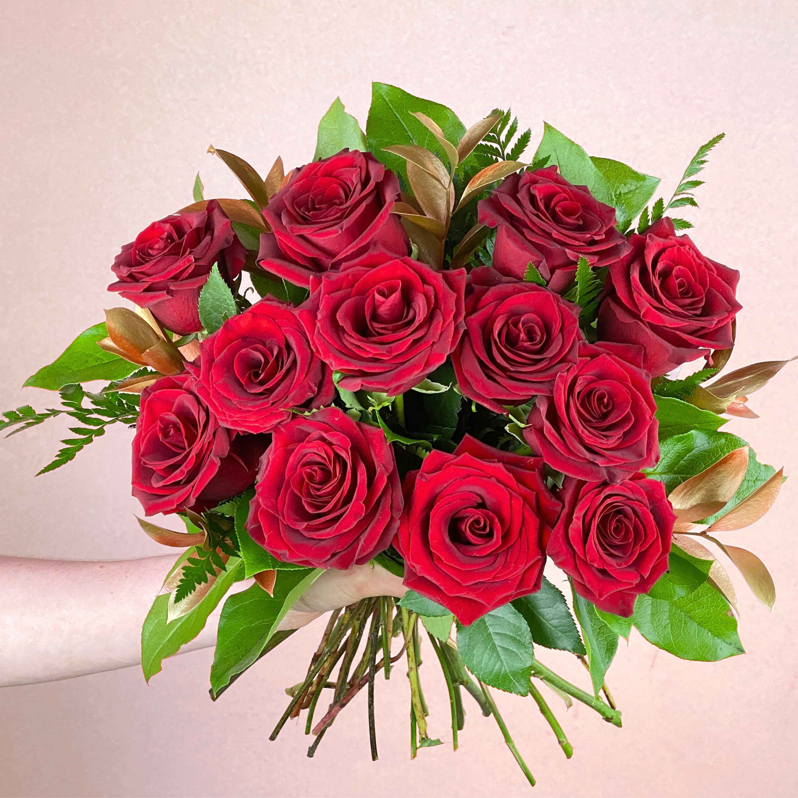This bouquet features 12 roses in a deep, velvety red paired with a hint of rosegold foliage… the ultimate indulgence. This classic ensemble will satisfy the most ravenous heart!