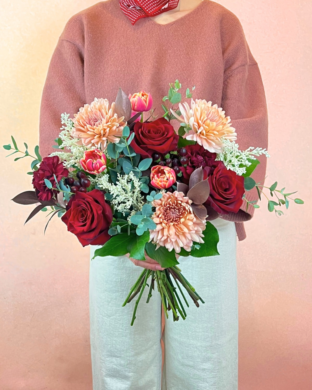 This rich and velvety bouquet combines shades of crimson and peach. A satisfying combination of sweetness with a little heat. Guaranteed to captivate their heart!