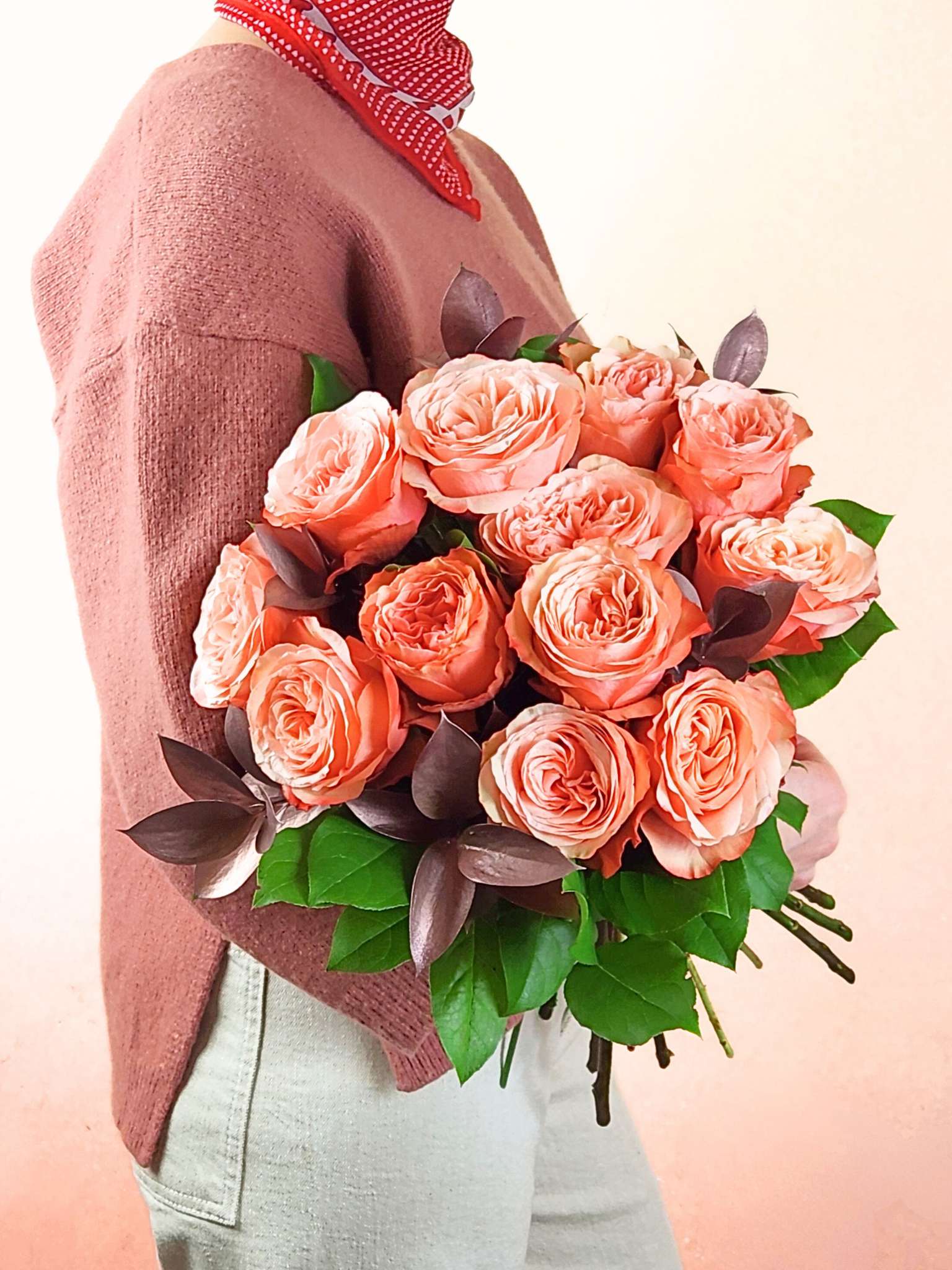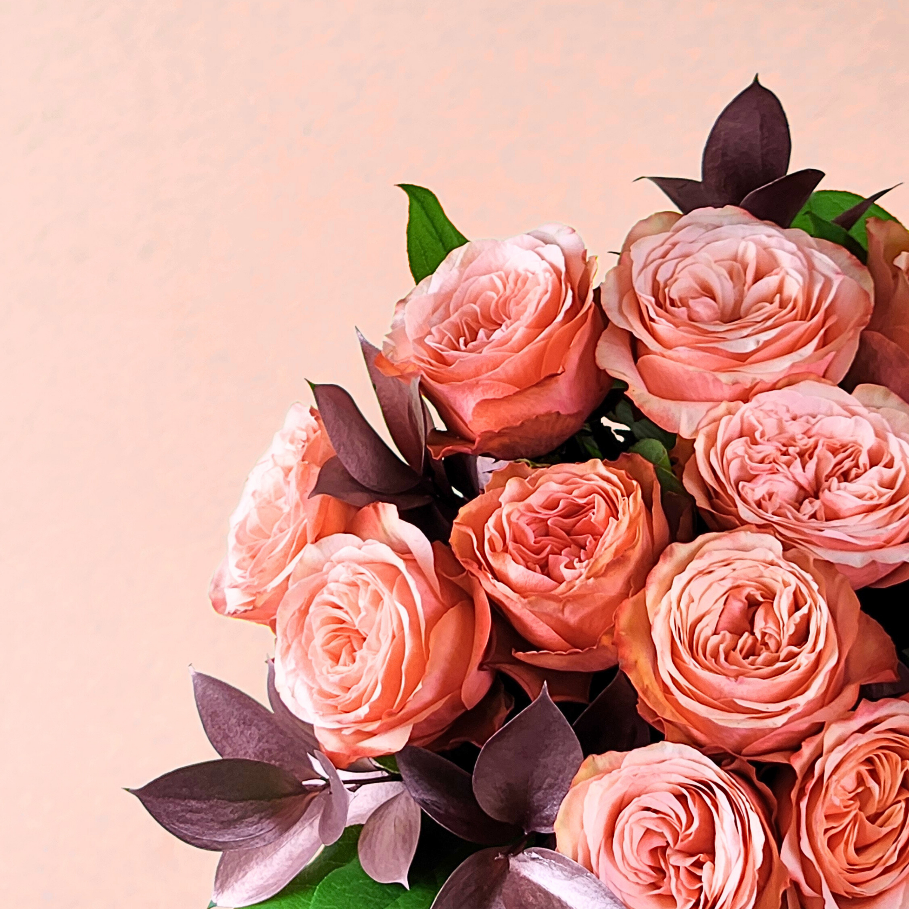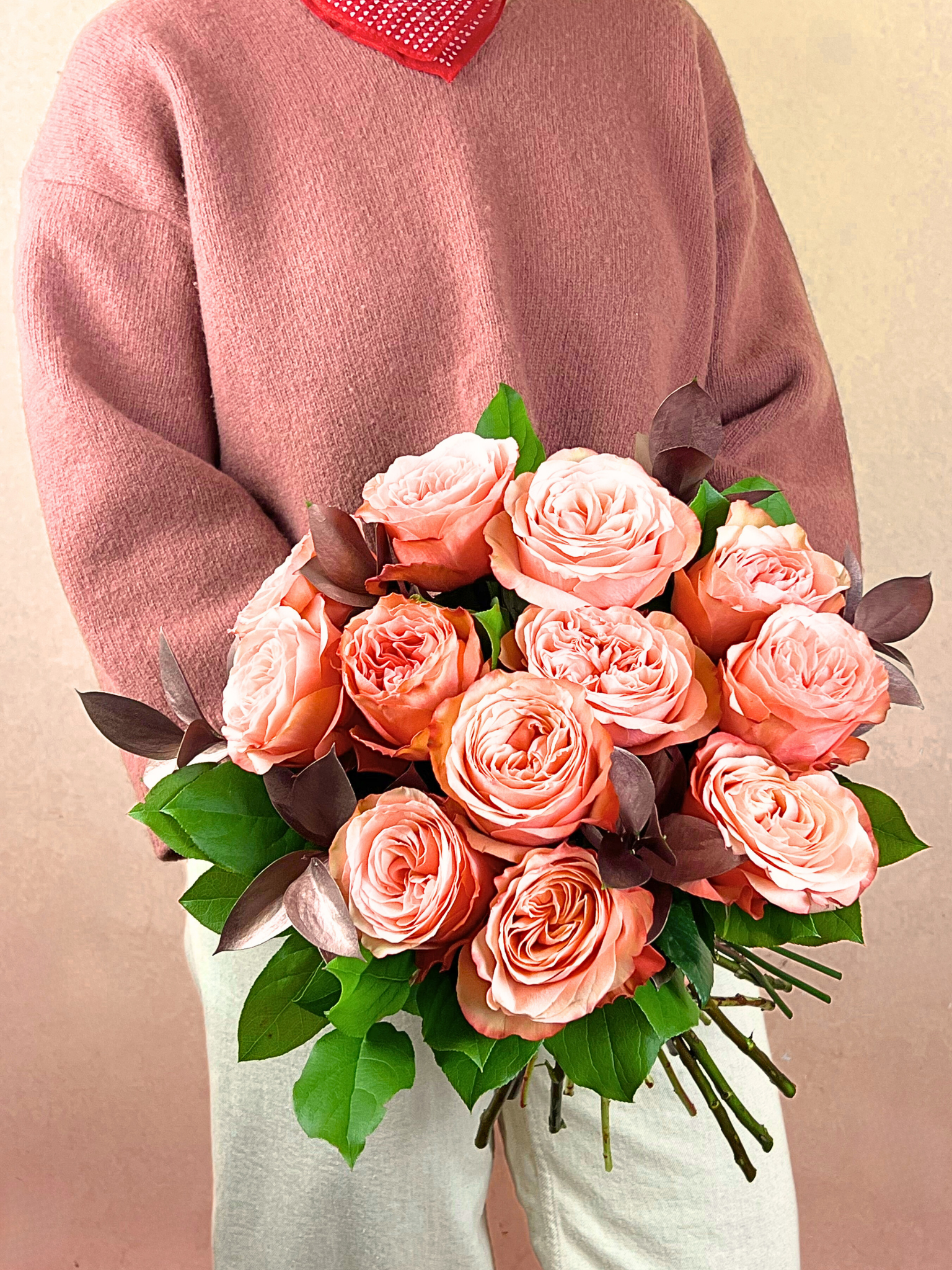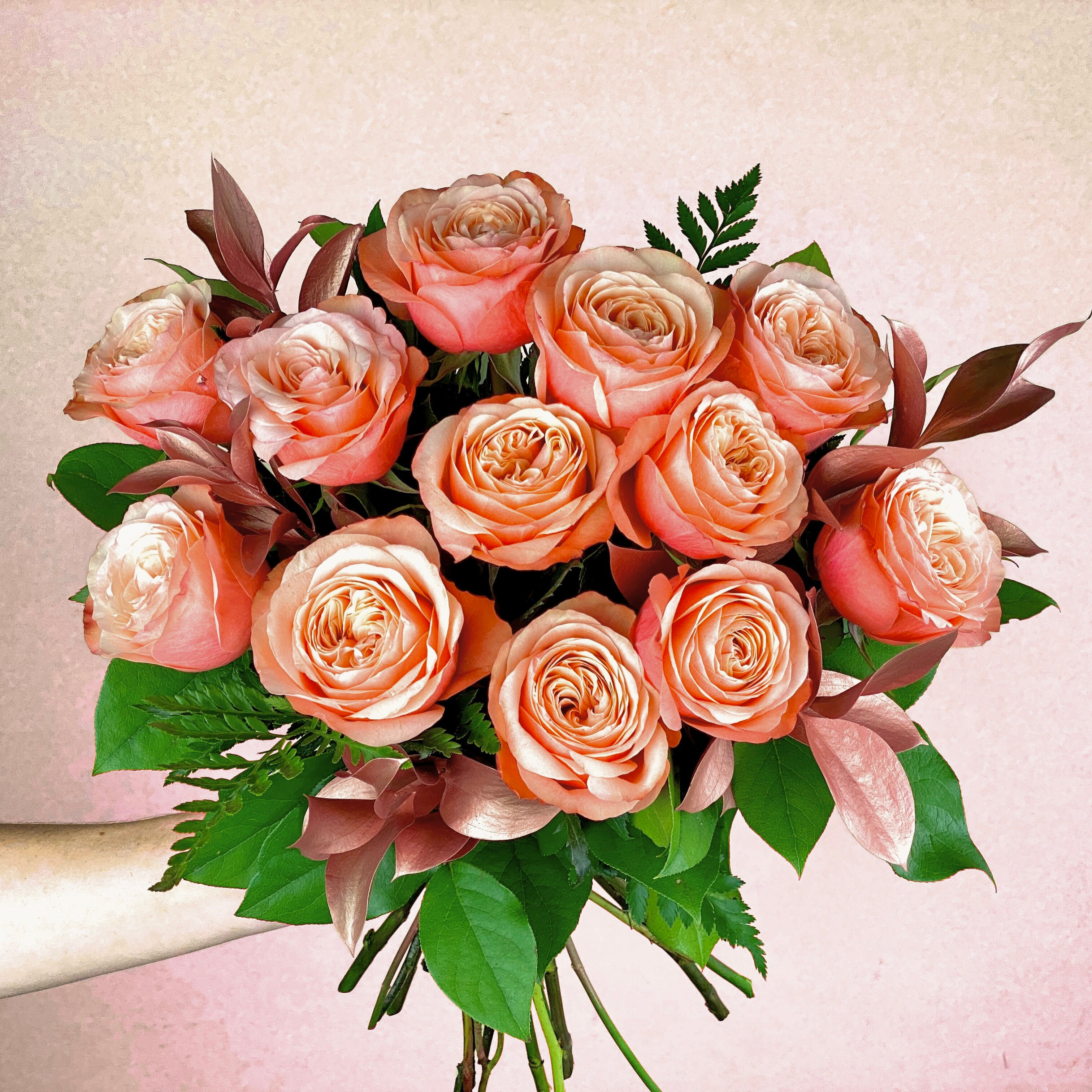 This bouquet features 12 soft peach roses with a hint of rosegold foliage. Baked to perfection and finished with a drizzle of everything nice. This sweet selection will quench all their cravings!